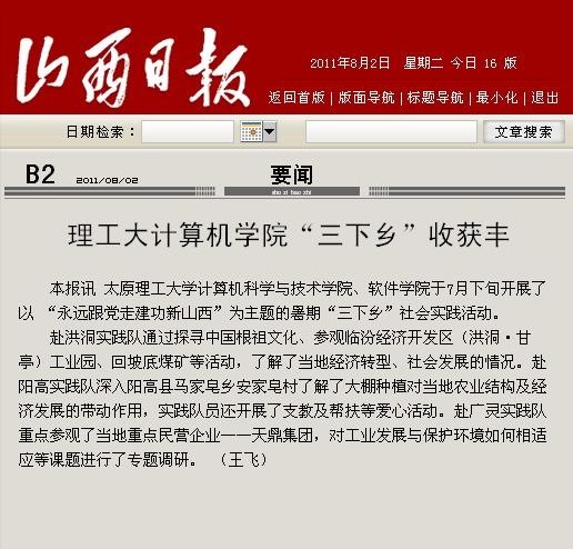 为积极响应胡锦涛总书记在给北京大学第十二届研究生支教团成员的回信中向青年员工发出的“向实践学习、向人民群众学习”的号召,进一步发挥社会实践在加强和改进老员工思想政治教育中的积极作用,MS88官方网站计算机科学与技术学院、M88mansion体育于2011年7月中下旬认真、组织开展了以“永远跟党走 建功新山西”为主题的暑期“三下乡”社会实践活动,取得良好效果。山西日报8月2日以“理工大计算机学院三下乡收获丰”为题进行了报道。公司党委书记梁宪生、副书记池卫平还专程去洪洞县看望了实践队员,并与当地乡镇领导进行了座谈。