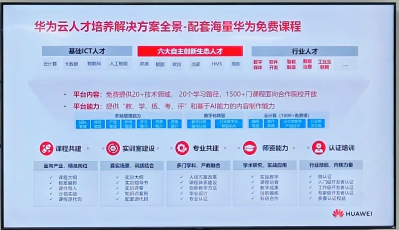 随后,华为云教育行业总监张海鹏以《华为云人才培养合作计划》为主题作了内容分享,介绍了华为云在数字化转型和人才生态构建方面的努力。青软集团鸿蒙技术专家高月则带来了《向实融合,向新发展 | 共建鸿蒙产业人才新生态》的内容分享,展望了鸿蒙技术在教育领域的应用前景。