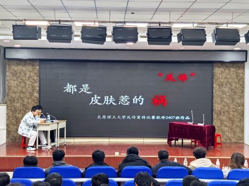 决赛现场,《人无往而不在枷锁之中》《处心积虑骗你财》《都是皮肤惹的祸》等作品剧情幽默、诙谐;融合旁白、音效、歌声;利用舞台剧、相声、等表现形式,避免了枯燥的说教,再现了诈骗分子的狡猾手段与受害者的心理变化,让同学们在轻松愉快的氛围中看到诈骗的无处不在,深刻感受诈骗的危害性,加强对诈骗的防范意识。