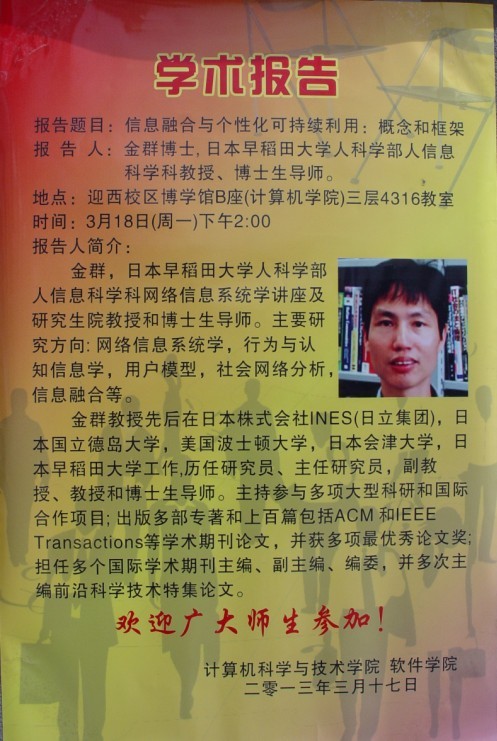 金群教授从研究背景出发,借助于云技术,详细的介绍了以“人”为中心的信息搜集和信息融合。在场的师生感觉受益匪浅。讲座结束之后,金群教授还与部分教师就某些问题进行了热烈的讨论。