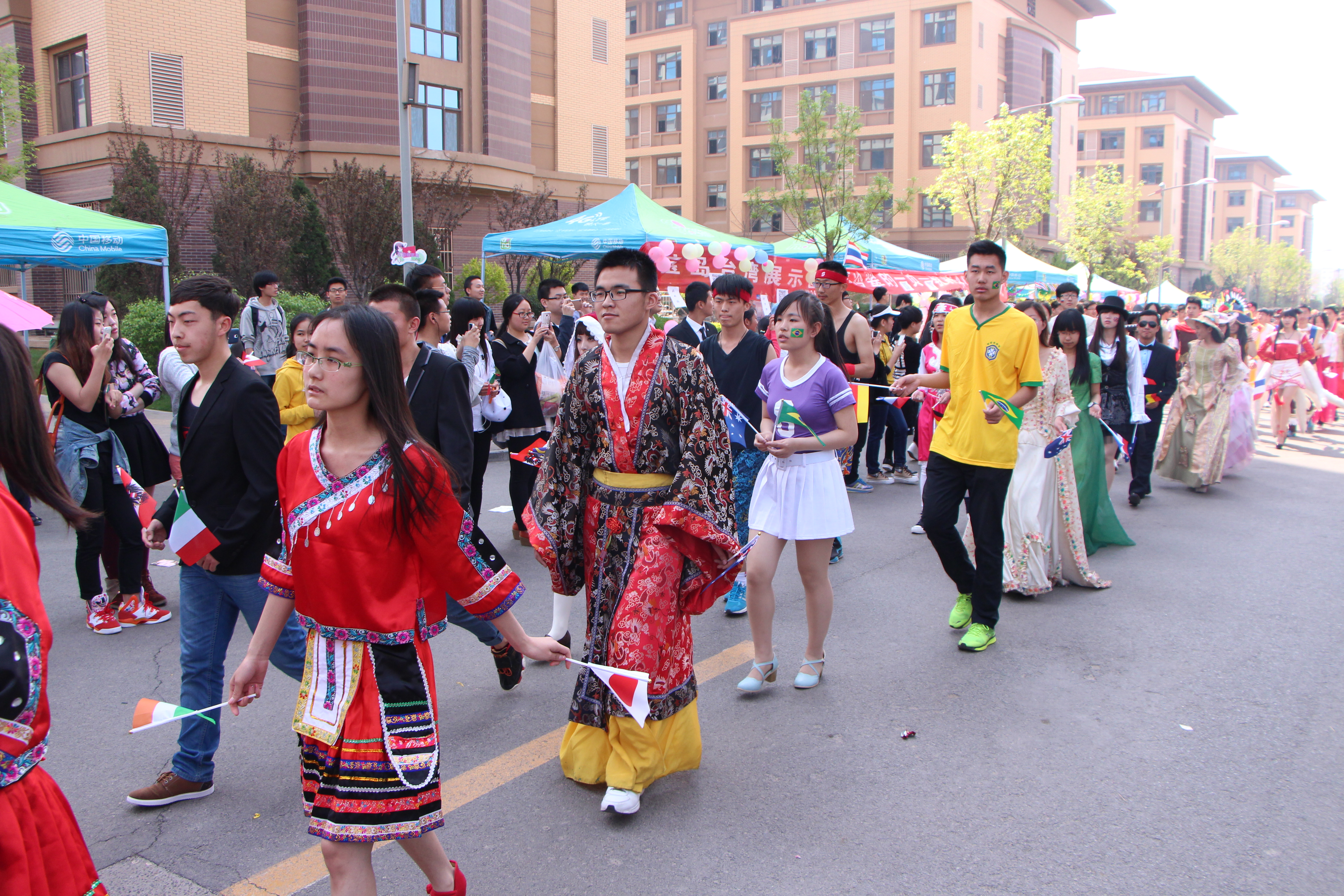 开幕式结束后,作为万国博览会序幕展示环节,精彩的走秀活动和极具创意的快闪活动将当天活动推向了高潮。走秀活动中,各个班级的代表身着本班所选国家或民族的特色服饰,手举国旗穿过人群,突然出现的快闪表演更是让围观的同学眼前一亮,不时发出热烈的赞叹。