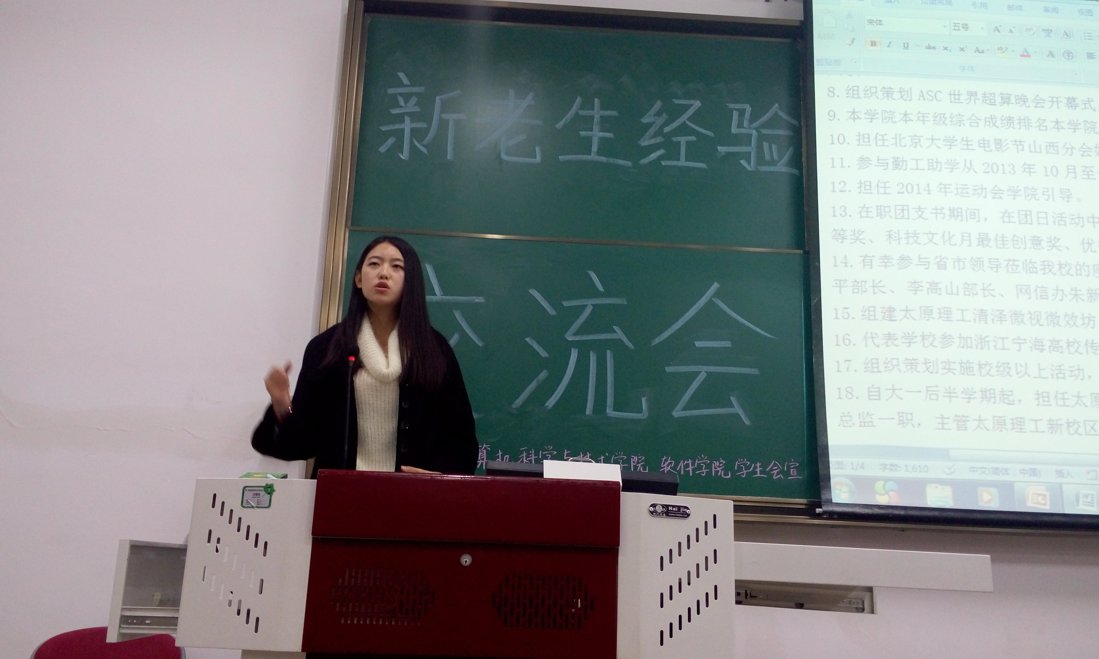 王昕璨从多方面进行发言。大学要学会丰富自己,展现自己。要找到适合自己的位置。你需要为了理想去改变自己。“先学习,再模仿,后超越”,学会借鉴别人的长处,让自己更优秀!