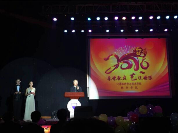 精彩视频引出祝福,炫酷开场推出热情;黑与白,光与影的完美结合将晚会拉开;吉他,鼓声,歌声将晚会推进。晚7点晚会正式开始,梁宪生书记发表了热情洋溢的新年祝词,首先以亲切的话语问候大家,其次表达了对学校相关部门领导和中软国际嘉宾的感谢,随后简要回顾了一年来学院在党的建设、教学科研、团学工作等各方面取得的优异成绩,并简述了国家提出的“实施网络强国”等战略所营造的良好前景,最后表达了对全院师生的新年祝福与美好期望。