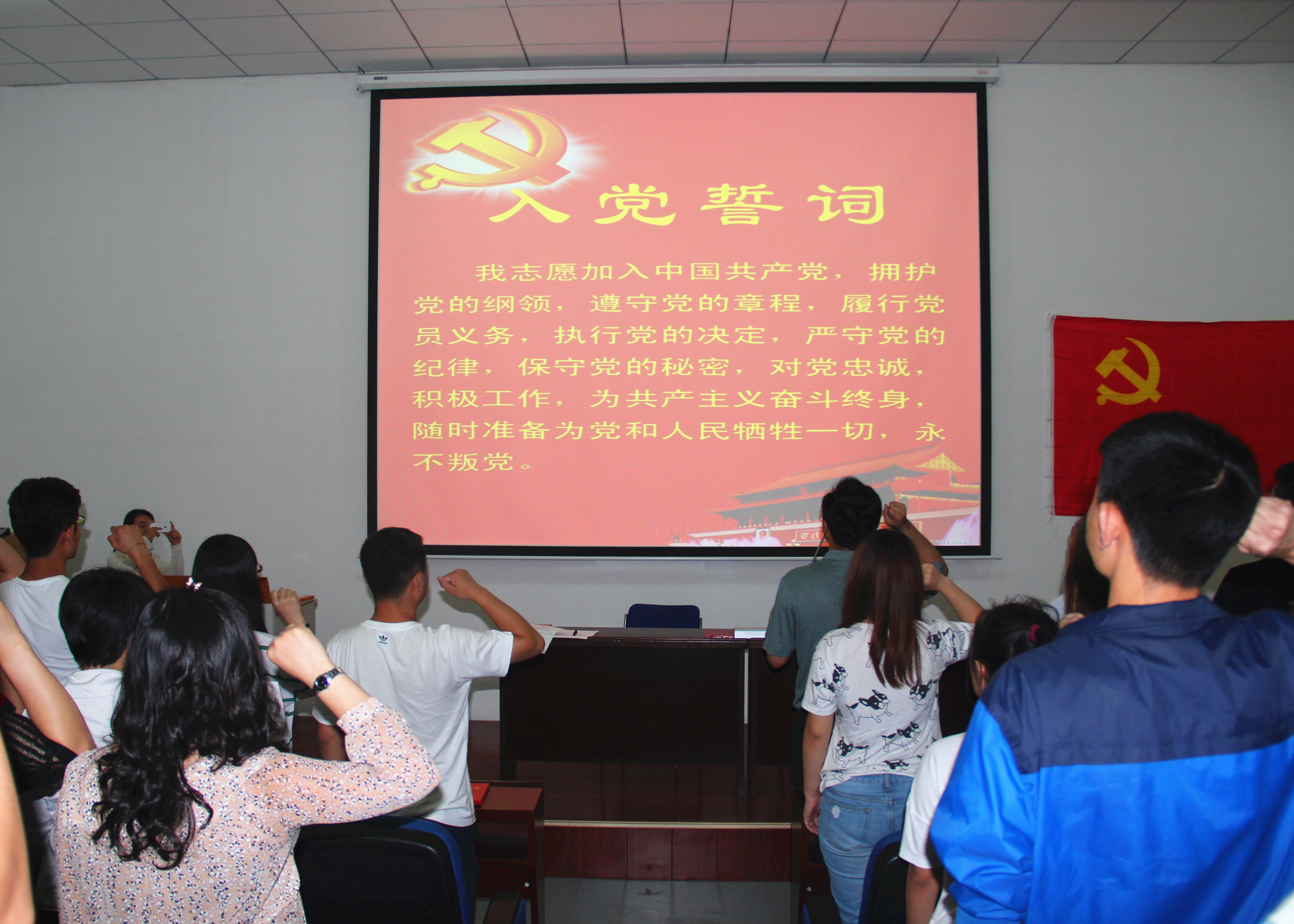 随后,公司党委领导梁宪生、池卫平为新党员代表佩戴党徽,为全体新党员配发党徽。接着,池卫平副书记领誓,全体新党员面向党旗,举起右拳,庄严宣誓,全体党员集体重温了入党誓词,铿锵有力的声音,表达了党员们为共产主义事业奋斗终生的决心。