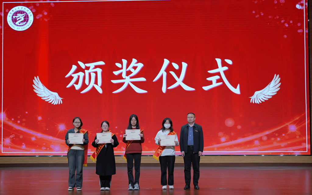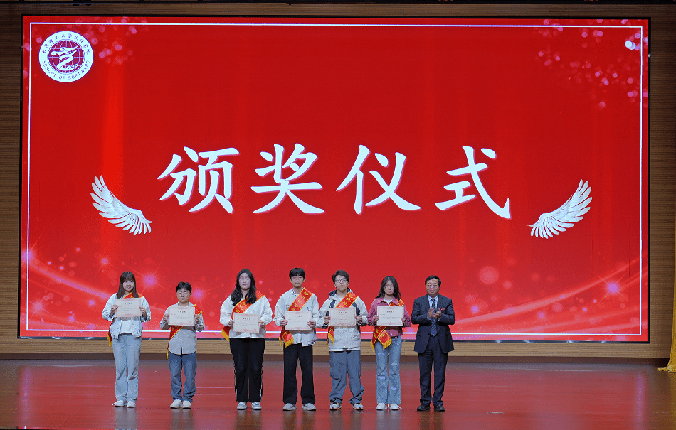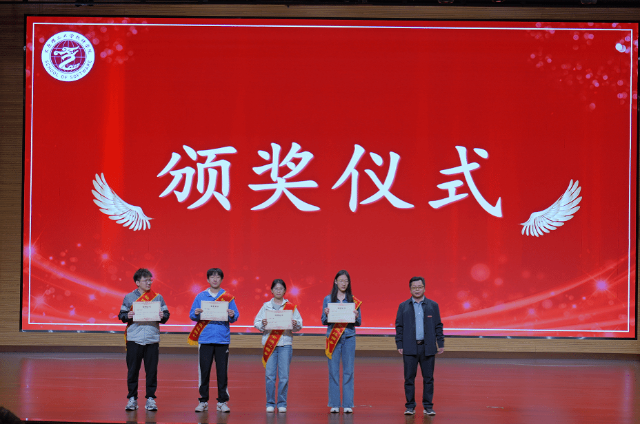 颁奖典礼上,张文基、赵涓涓、曹锐、刘松华分别为零挂科班集体、学业优秀班集体、四六级全通过宿舍、四级全通过宿舍颁奖。