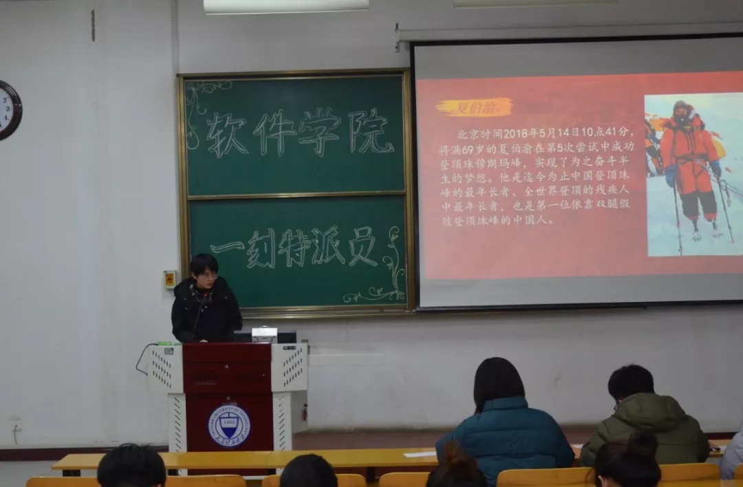 “我的心里就有那么一座山!”首先,大家跟随着顾晓春同学,一起走入追梦者夏伯渝的世界。夏伯渝为帮助队友而致残,患癌症也不曾放弃,三次冲顶珠峰最终圆梦的故事,打动了在场的每一位同学。接着,田苗苗同学与我们分享了“国之骄傲”姚明的奋斗历程。他为了梦想不服输的精神以及为祖国篮球事业做出的伟大贡献,更是让人心为之一振。最后,李欣芸同学以华为的发展作为切入点,分享了中国今天的科技发展,同学们对科技强国有了更深刻的认识,也将活动气氛再次推上高潮。