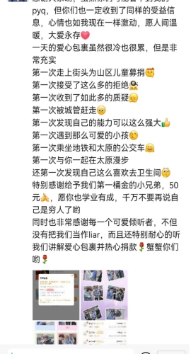 包裹虽小,但爱心无限。爱心包裹活动结束后,志愿者们在各个社交平台分享自己的收获与成果,以及自己参加活动的心得体会。虽然活动结束,但同学们对公益的热忱以及对山区儿童的关爱丝毫不减。小包裹涵盖大爱心,温暖孩子们的冬天,每一个包裹里都承载着众位善行英雄的爱心以及对孩子们的关心,蕴含着对孩子们的美好祝愿以及殷切期许。
