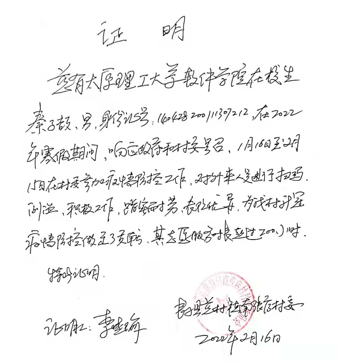 1929班秦子颉,于1月16日至2月15日在山西省长治市长子县南张店村参加疫情防控工作,主要在村口对外来人员健康码、行程卡、体温等进行检查登记。他表示:在志愿服务过程中,我深刻感受到了疫情形式的严峻,以及一二线防疫工作者的艰辛。今后我还会义不容辞的冲到疫情防控的前线,牢记共产党员为人民服务的初心与使命。不负韶华,勇往直前!