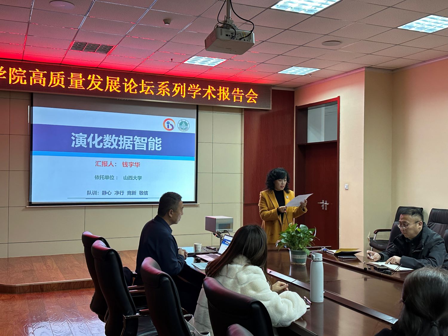 赵涓涓教授向参会人员介绍了钱宇华教授的个人情况和研究方向,并代表学院向钱宇华教授的到来表示热烈欢迎。随后,钱宇华教授作了题为“演化数据智能”的报告。钱宇华教授首先梳理了科学研究中的五种范式,并提出第三代人工智能的一种新范式——“演化数据智能”,即让人工智能可以像生物界一样,从智能个体、智能种群与智能生态三个视角自适应进化。随后,钱宇华教授凝练了演化数据智能背景下人工智能领域的十个基本科学问题,包括学习随机一致性的消除、关联关系挖掘、多模态统一语义表示、群体智能涌现原理等,并介绍了其团队在这十个问题上的研究成果。然后,钱宇华教授介绍了其团队在人工智能十个共性关键技术取得的突破,包括微光视觉增强与感知、动态目标抓取与控制、逆向因果学习与推理技术等。最后,钱宇华教授展望了人工智能研究远景目标,就是让人工智能有一种通用的视角,具备适应性、演化性和涌现性,智能体可通过进化来适用不同场景不同任务,从数据中智选智能,在进化中提升智能。