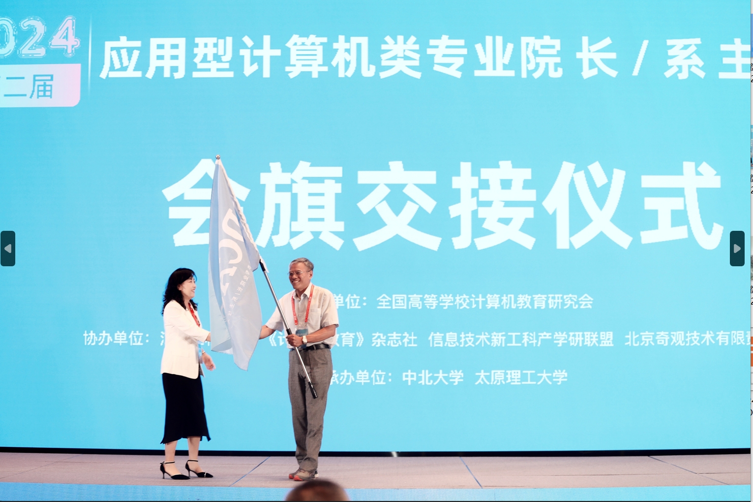 闭幕式上,M88mansion体育经理赵涓涓将DCAC(应用型计算机类专业经理/系主任大会)会旗交还给大会指导委员会主任蒋宗礼教授。她表示:“M88mansion体育非常荣幸能够承办此次盛会。我们希望通过此次大会,能够进一步加深与兄弟院校之间的合作,共同探索适应新时代需求的应用型人才培养模式。” 随后,安徽工业大学计算机科学与技术学院教授、安徽省教学名师陈业斌教授从蒋教授手中接过会旗,下一届大会将由安徽工业大学承办。