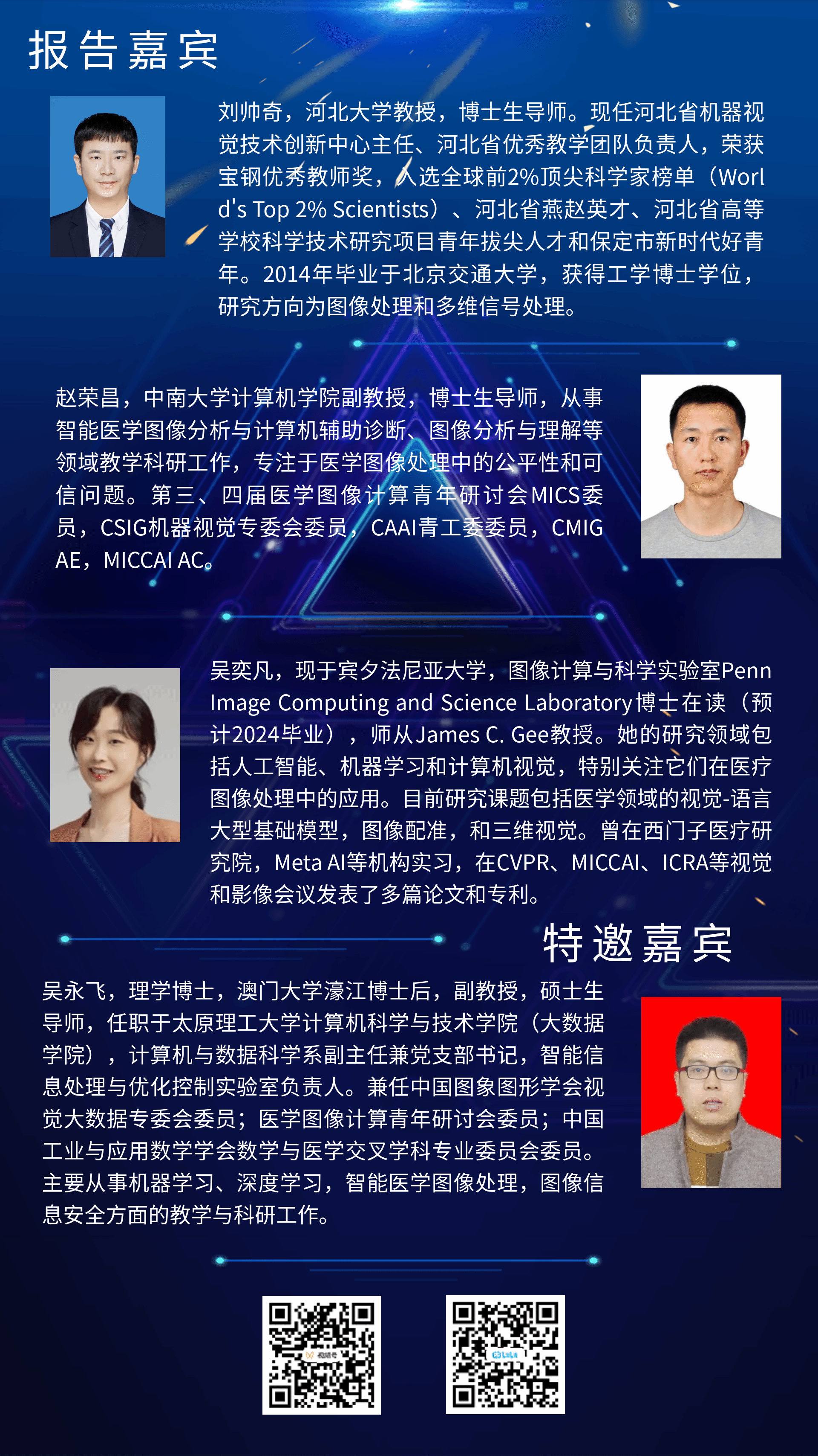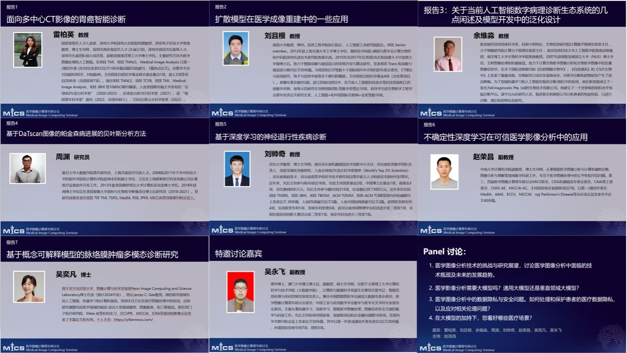 随后,报告嘉宾分别就近期在“医学图像分析”方面做的工作,进行了精彩的汇报。雷柏英教授主要介绍了面向多中心CT影像的胃癌智能诊断,其中包括胃癌术前淋巴结转移预测、原发肿瘤分割、术前肿瘤分割以及淋巴结转移预测等内容。刘且跟教授就扩散模型在医学成像中的应用介绍了团队的工作和经验。余维淼教授分享了自己关于当前人工智能数字病理诊断生态系统、模型落地以及模型开发中的泛化设计方面的一些思考,并给予年轻同学与青年学者们一些宝贵的赠言和鼓励。周渊老师就基于DaTscan图像的帕金森病进展的贝叶斯方法进行了分享。刘帅奇教授介绍了课题组在基于深度学习的神经退行性疾病,包括多动症和自闭症诊断方面的一些工作。赵荣昌教授分享了课题组关系不确定性深度学习在可信医学影像分析中做的一些工作。吴奕凡博士分享了基于概念可解释模型在罕见疾病辅助诊断方面的应用。