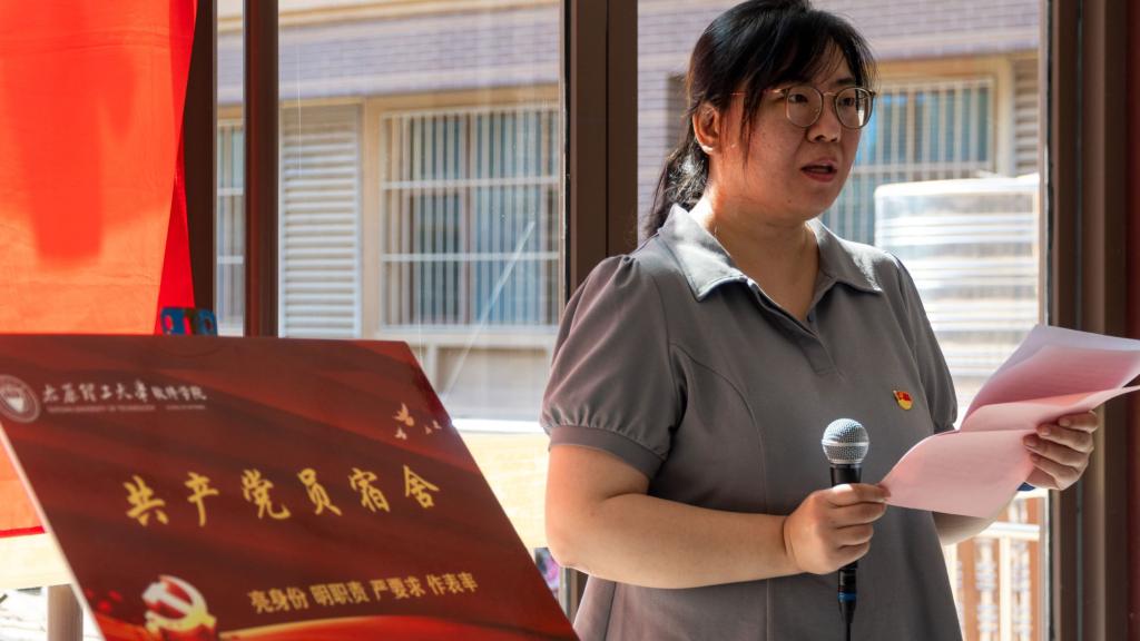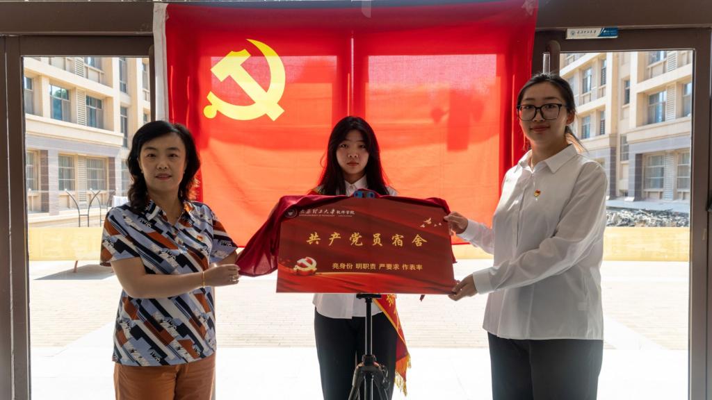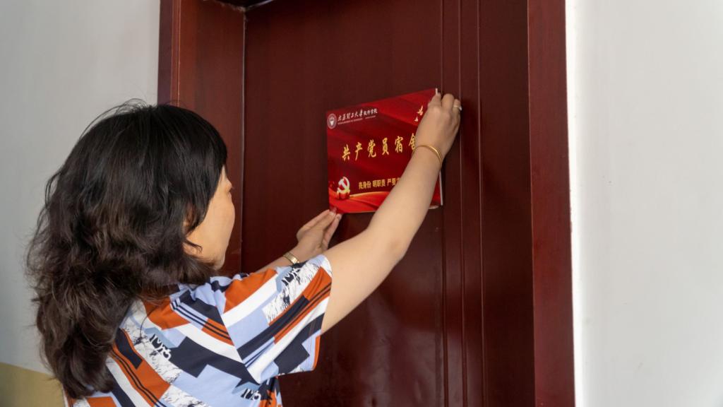 最后,赵涓涓、郭飞、王泽与教师党员代表一起前往党员宿舍。赵涓涓亲自为员工党员宿舍挂上“党员宿舍”牌匾,强调员工党员要将自己所在的寝室建设成内务整洁、学风优良、服务奉献、安全文明的模范型宿舍,充分发挥模范带头作用,并引领员工宿舍积极向党员宿舍看齐。