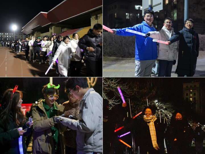 寒冷的天气抵挡不住内心的热情,阻挡不住奋进的脚步。音乐节后,郭飞副书记宣布荧光夜跑正式开始。一众队伍齐头并进,畅跑在自由的空气中,点点荧光汇聚成光的海洋,映射出青春的模样。工作人员也站在每一个路口为前行者指引方向,同时热情地挥舞着手中的荧光棒,为他们呐喊加油。清朗夜空下,荧光头饰与手中的荧光棒一起点亮了太理,汇聚成荧荧闪耀的“环”校大银河!