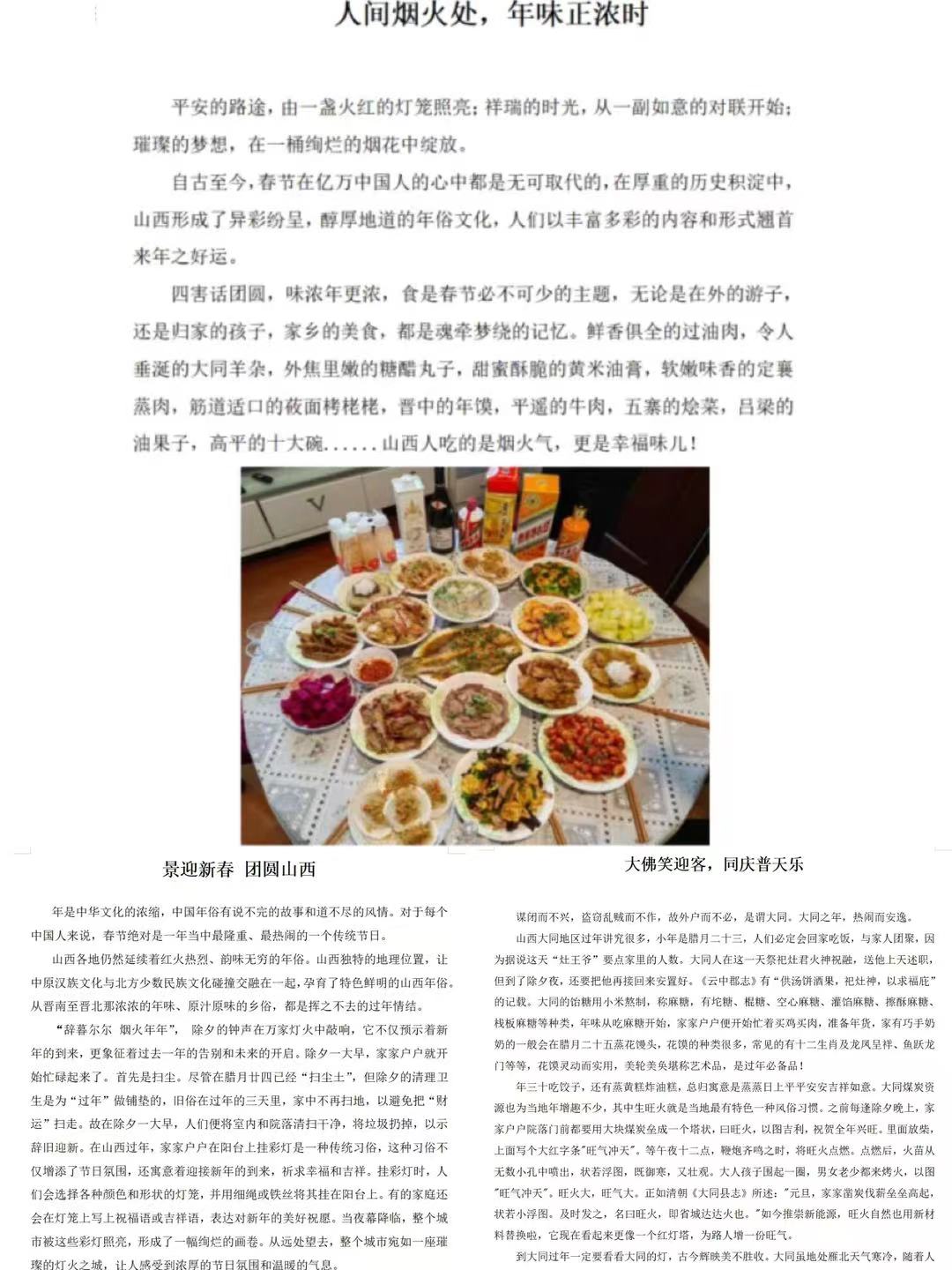 大同年,大不同。软件2246班李蔚亲身感受大同的年俗活动中传统的民间艺术表演、特色美食节、以及各种庙会活动,并通过视频的形式展现了北方特有的庆祝方式。人们通过这些活动以及放鞭炮、挂灯笼、贴春联等方式来庆祝新年,体现了对传统文化的传承,也表达了对未来一年美好期望。大同的年俗活动也吸引了众多游客前来体验。