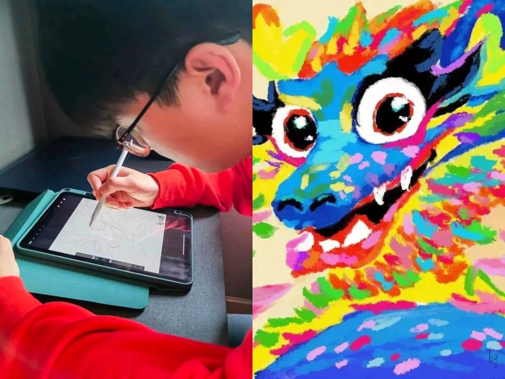 龙腾四海,福满人间。与众不同的是色彩,是绘画方式,心意相同的是祝愿,是美好。我用彩色油画棒画出风风火火的中国龙,想借诗句表达我的祝福:金龙腾跃闹新春,春意盎然福满门。盛世荣光常照耀,岁岁平安乐逍遥。