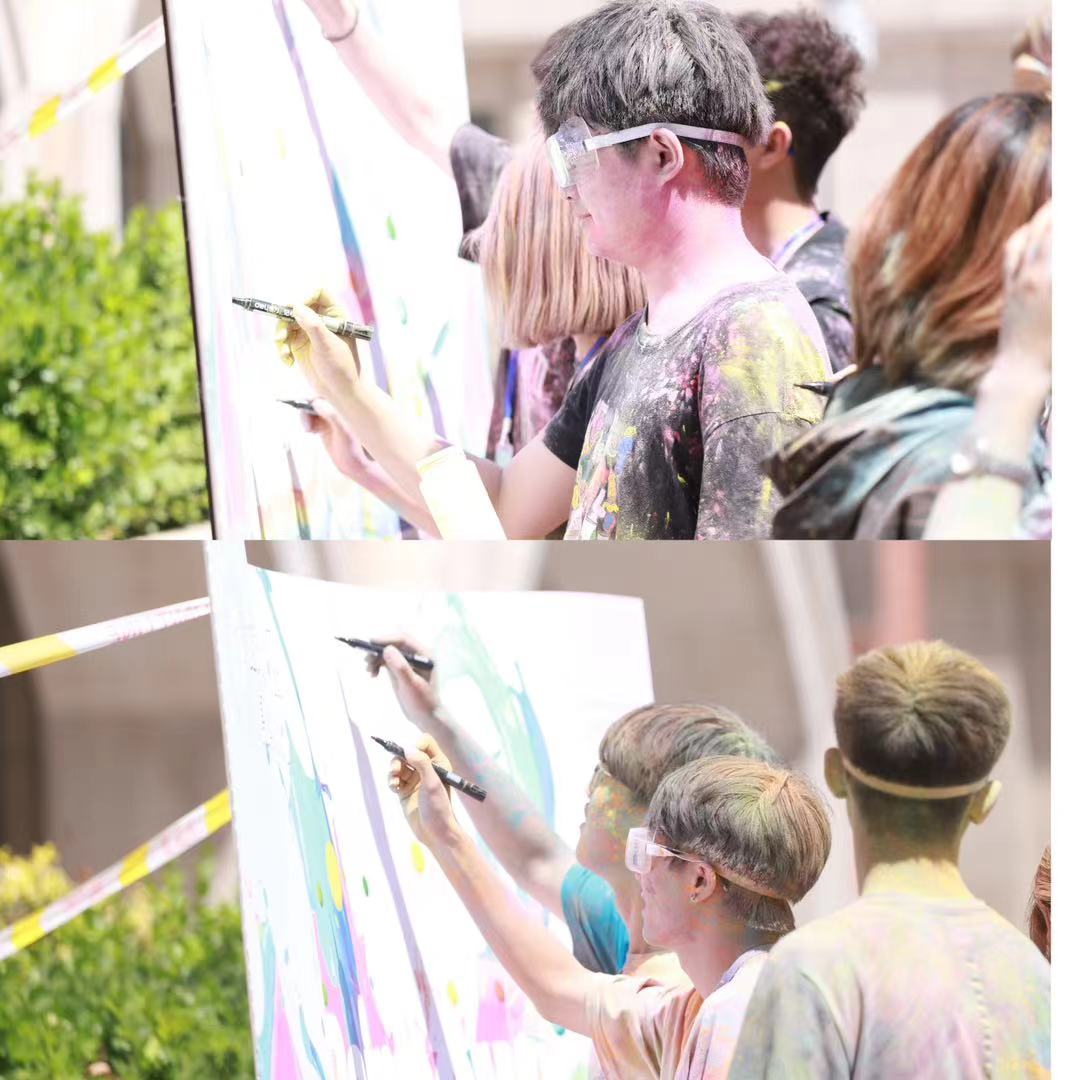 赤橙黄绿青蓝紫,是彩虹的痕迹,是青春的证明。彩粉大战结束后,大家在签名墙上认真地写下自己的名字,留下他们的青春印记,不同的笔迹交织在一起,宛如青春的战歌,温暖而有力。
