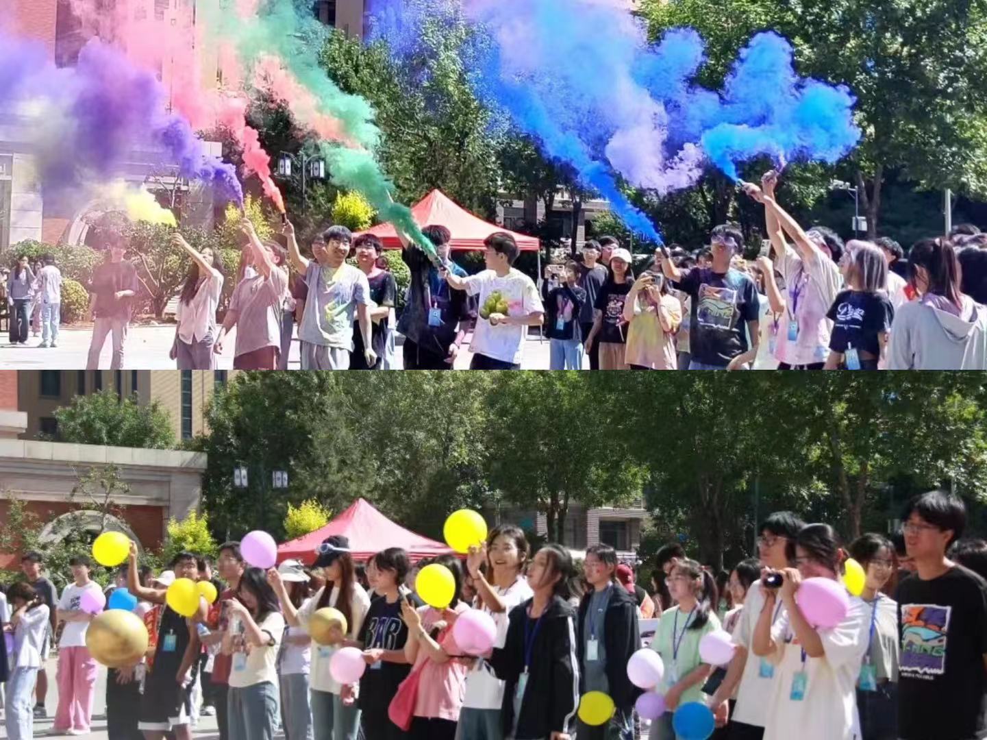 随着一声令下,开彩仪式启动。缕缕彩烟喷向高空,彩色气球逐个戳破,顷刻间,气球中的彩粉像烟花一样爆发出来,纷纷扬扬地洒落在每个人的身上,欢呼声此起彼伏,大家不亦乐乎。漫天的色彩宣告着彩虹狂欢的开始,大家迫不及待地奔向各个站点,沉浸在轻松愉快的游戏氛围中。