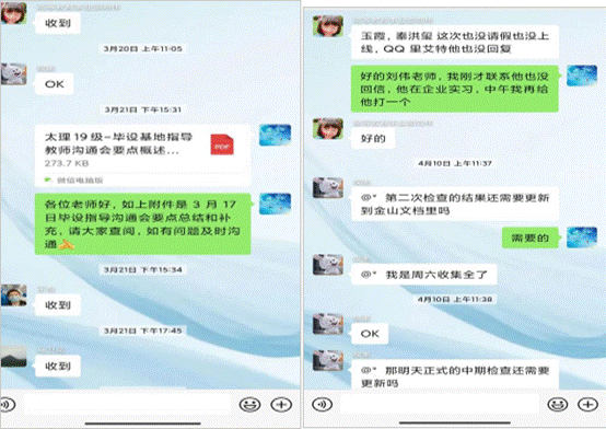 在整个毕设工作期间,基地老师和员工保持密切联系,大部分员工都能够积极配合各个流程的工作,按时参加检查,按时提交相应文档,部分不够积极主动的员工,基地加强沟通,对重点员工班主任老师也会单独沟通和了解情况,并反馈给基地毕设指导老师,探讨具体实施方案。