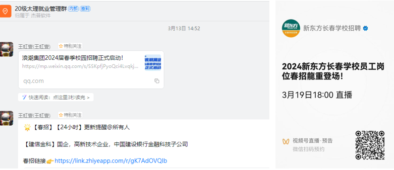 这次促就业专项行动采用线上线下两种方式进行。线上主要是抢抓春季招聘期,每日企业分享和推荐;建立校企微信工作群,每日互通就业/招聘工作信息,实现了校企一体,信息沟通无阻;同时在企业的公司学长为学弟学妹们进行岗位内推。